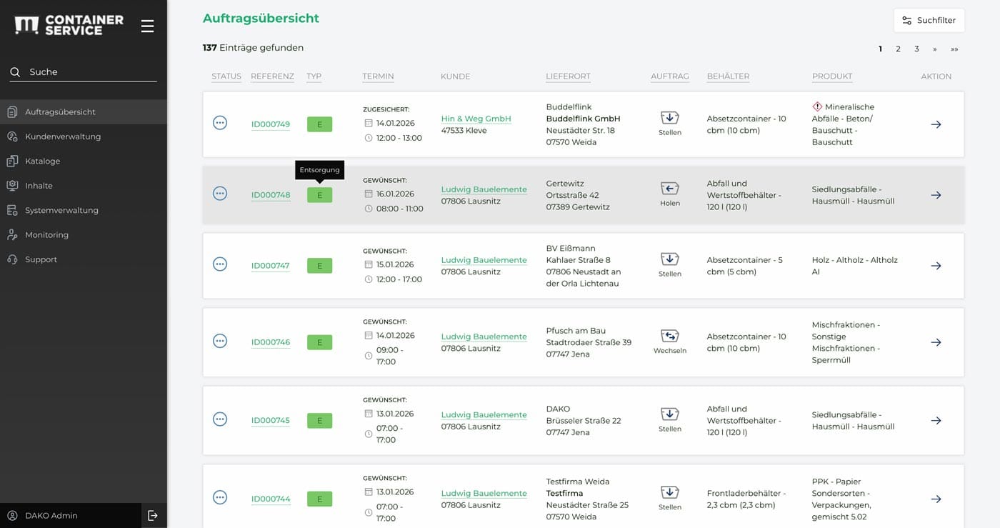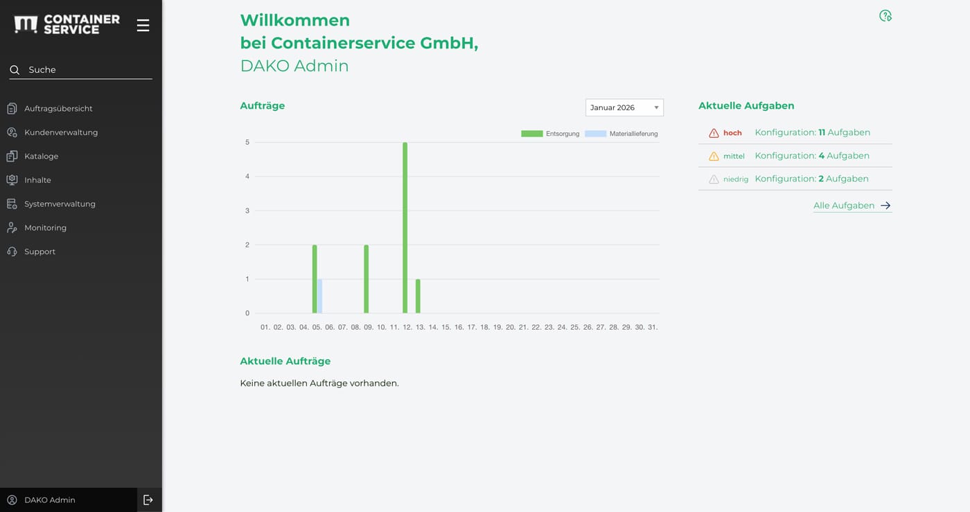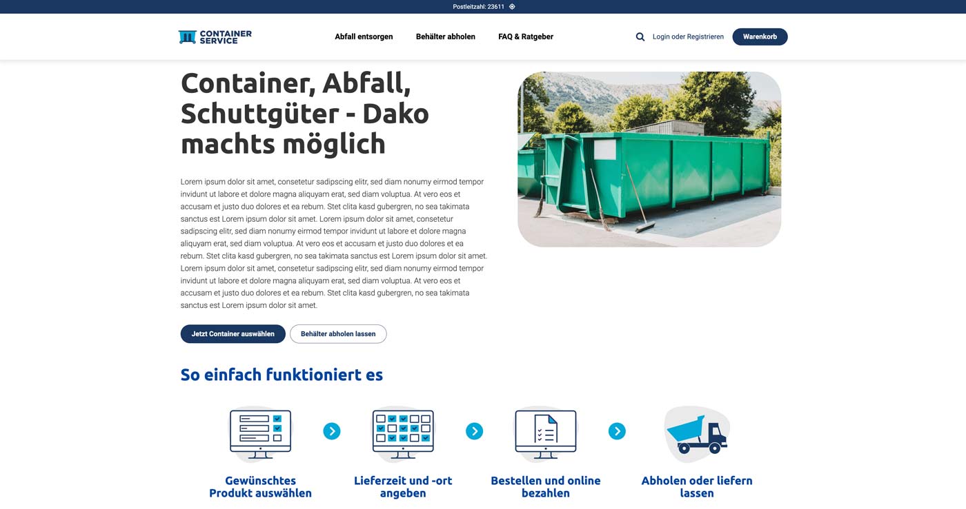 DAKO Sales Entsorger ist ein webbasiertes Kundenportal für Containerdienste und Entsorgungsunternehmen, mit dem Aufträge digital verarbeitet und dokumentiert werden können. Orientiert am Branchenstandard AvaL können Ihre Geschäftskunden damit ohne Umwege die gängigen Auftragsarten individuell und mit konkretem Termin und Lieferort anfragen. Die individuelle Gestaltung des Portals mit Ihrem Firmenlogo, Ihrem Unternehmensdesign und angepasst auf Ihren konkreten Leistungskatalog sichert einen hohen Wiedererkennungswert und Zeitersparnis für alltägliche Routineaufgaben.
