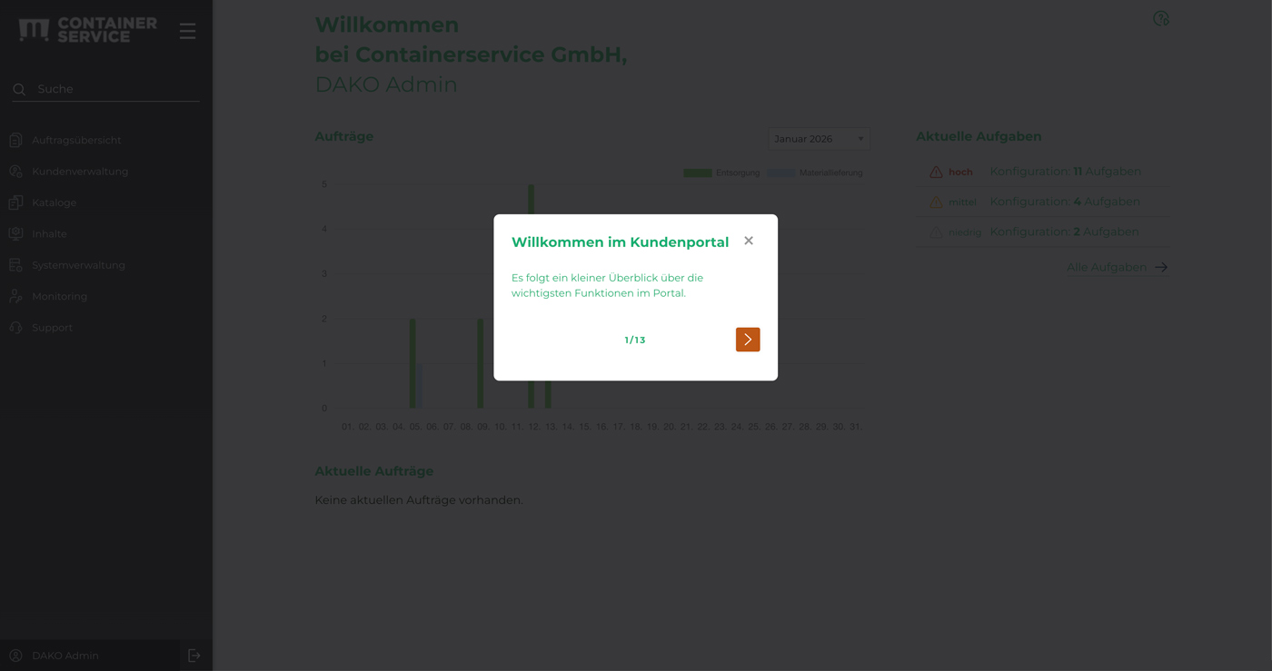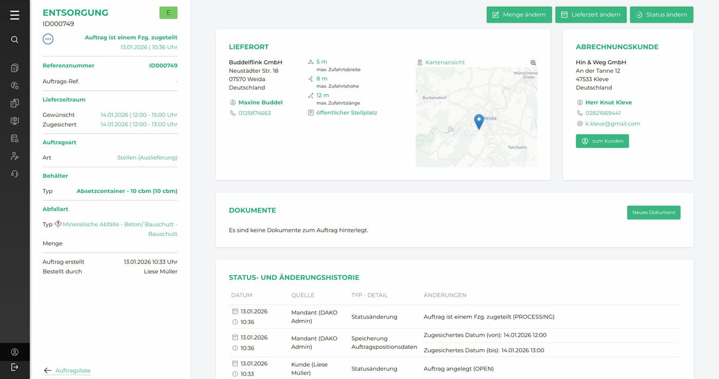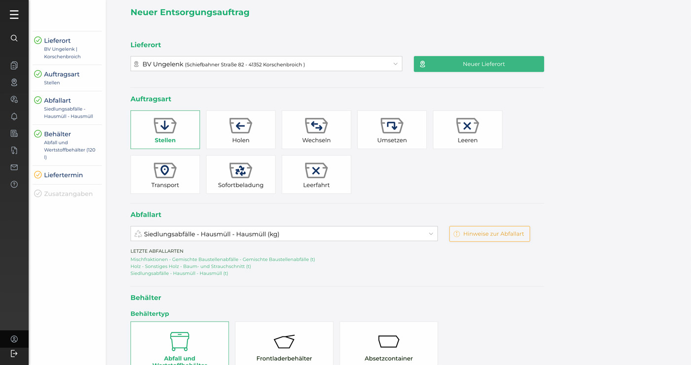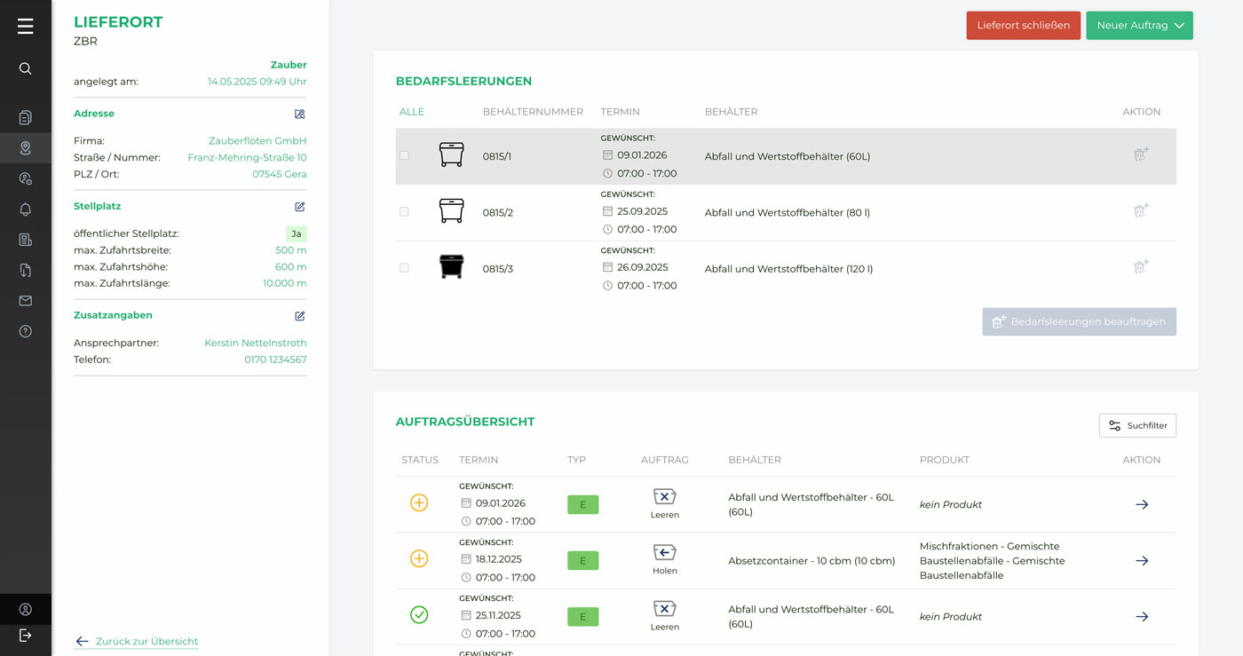 DAKO Sales Entsorger ist ein webbasiertes Kundenportal für Containerdienste und Entsorgungsunternehmen, mit dem Aufträge digital verarbeitet und dokumentiert werden können. Orientiert am Branchenstandard AvaL können Ihre Geschäftskunden damit ohne Umwege die gängigen Auftragsarten individuell und mit konkretem Termin und Lieferort anfragen. Die individuelle Gestaltung des Portals mit Ihrem Firmenlogo, Ihrem Unternehmensdesign und angepasst auf Ihren konkreten Leistungskatalog sichert einen hohen Wiedererkennungswert und Zeitersparnis für alltägliche Routineaufgaben.